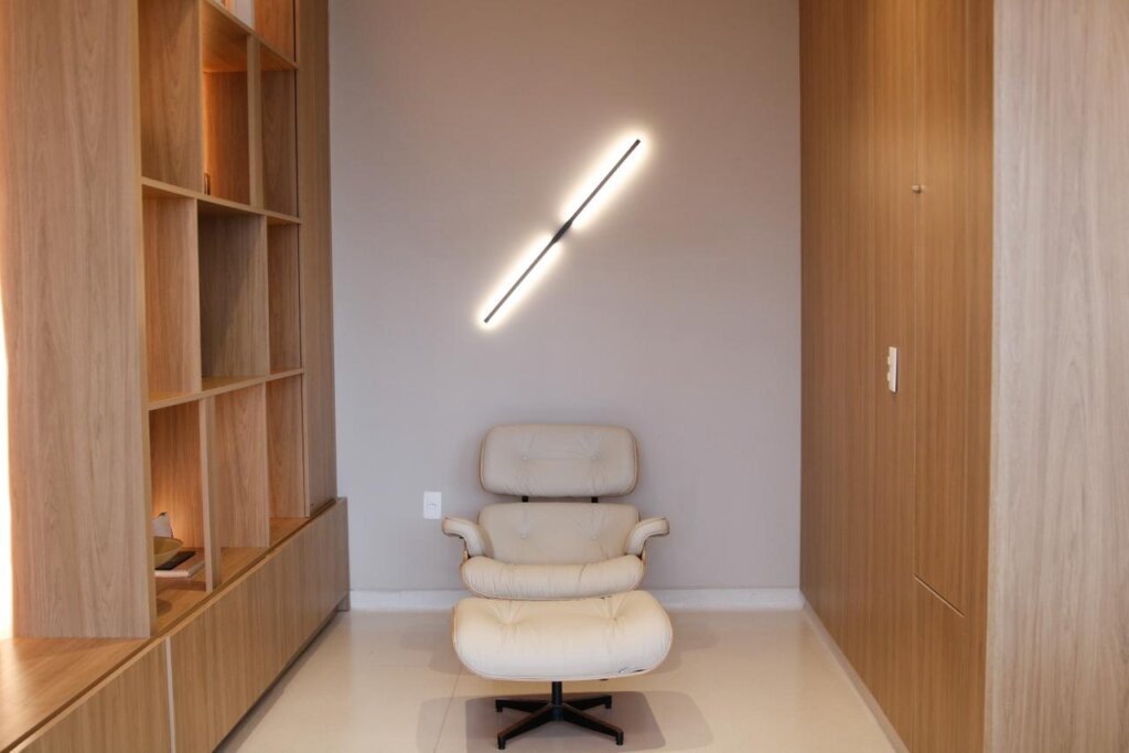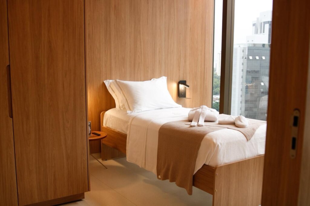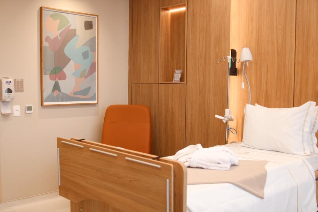 Os andares reúnem 30 leitos distribuídos entre 22 apartamentos, 7 suítes e uma suíte master de 142 m². Todos foram planejados para oferecer privacidade, conforto e sofisticação, com ambientes automatizados, design contemporâneo e mobiliário assinado. A suíte master conta com home theater, sala de reuniões, lavabo e área de leitura, criando um espaço pensado para pacientes que desejam manter rotina e discrição mesmo durante a internação.
