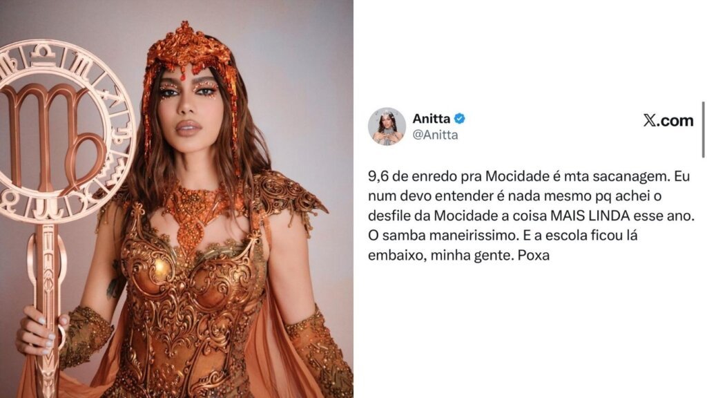 No X, antigo Twitter, a cantora se mostrou indignada. “9,6 de enredo para a Mocidade é muita sacanagem. Eu num devo entender é nada mesmo porque achei o desfile da Mocidade a coisa mais linda esse ano. O samba maneiríssimo. E a escola ficou lá embaixo, minha gente. Poxa”, escreveu.