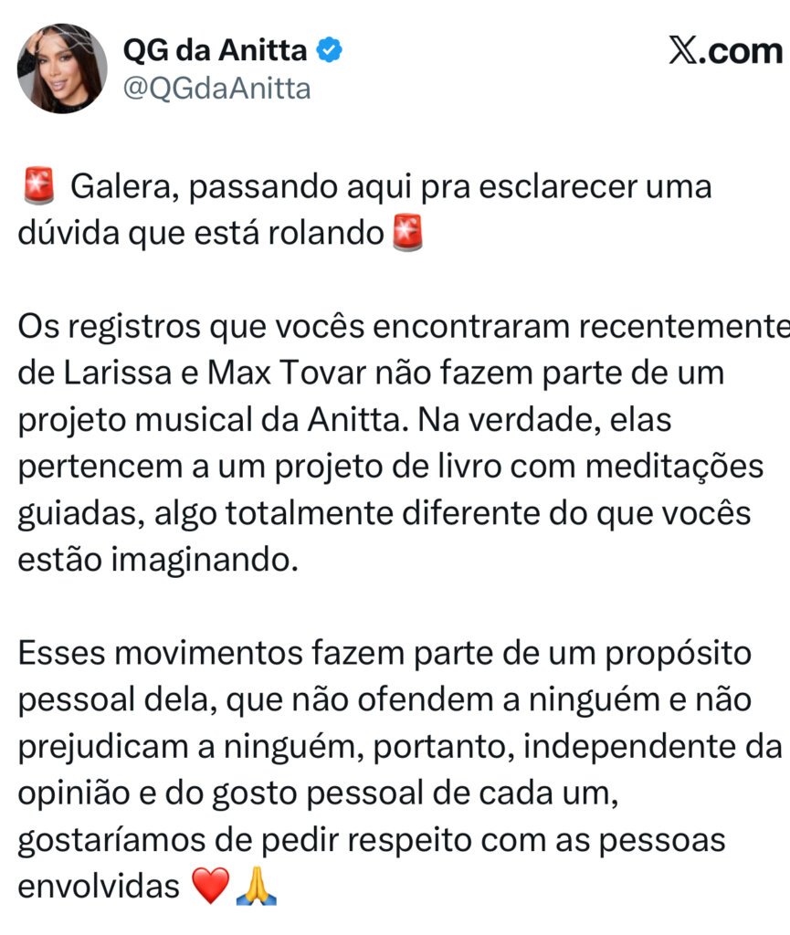 Logo após os fãs de Anitta descobrirem que a cantora registrou 33 músicas no ASCAP, associação americana de direitos autorais, ao lado de Max Tovar, sua guia espiritual, a equipe da artista se pronunciou para esclarecer os boatos. Segundo o comunicado, os registros não se tratam de um projeto musical, mas sim de um livro de meditações guiadas, ligado a um propósito pessoal da artista.