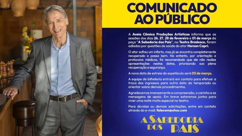 Em comunicado, a produção informou que Capri já está recuperado e passa bem, mas seguirá afastado dos palcos por recomendação médica. A orientação é priorizar a plena recuperação e a segurança do ator.