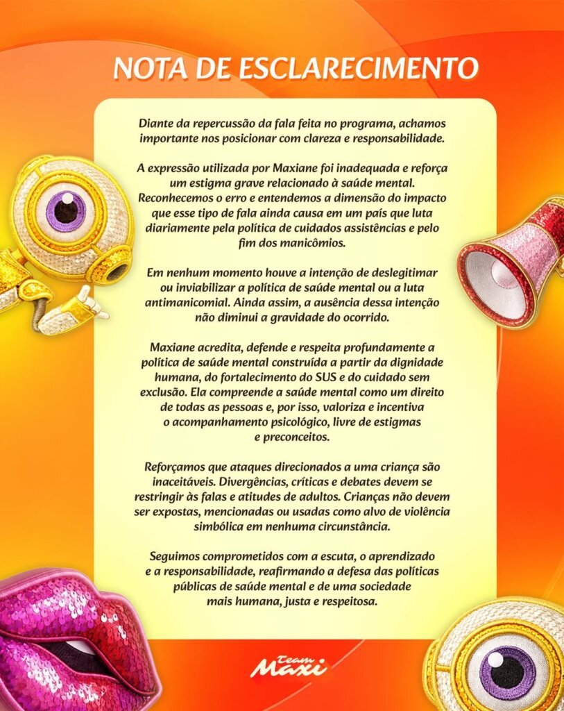 Em nota, a equipe da participante reconheceu que a expressão utilizada foi inadequada, admitiu o erro cometido por Maxiane e ressaltou que não compactua com discursos que reforcem preconceitos ou estigmas relacionados à saúde mental.