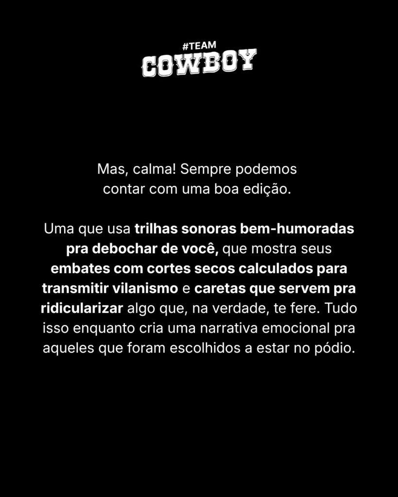 Entre as reações, a equipe de Alberto Cowboy fez duras críticas à condução do reality e levantou questionamentos sobre a imparcialidade do programa. No post, os administradores apontaram situações que, segundo eles, teriam prejudicado o brother dentro do confinamento.