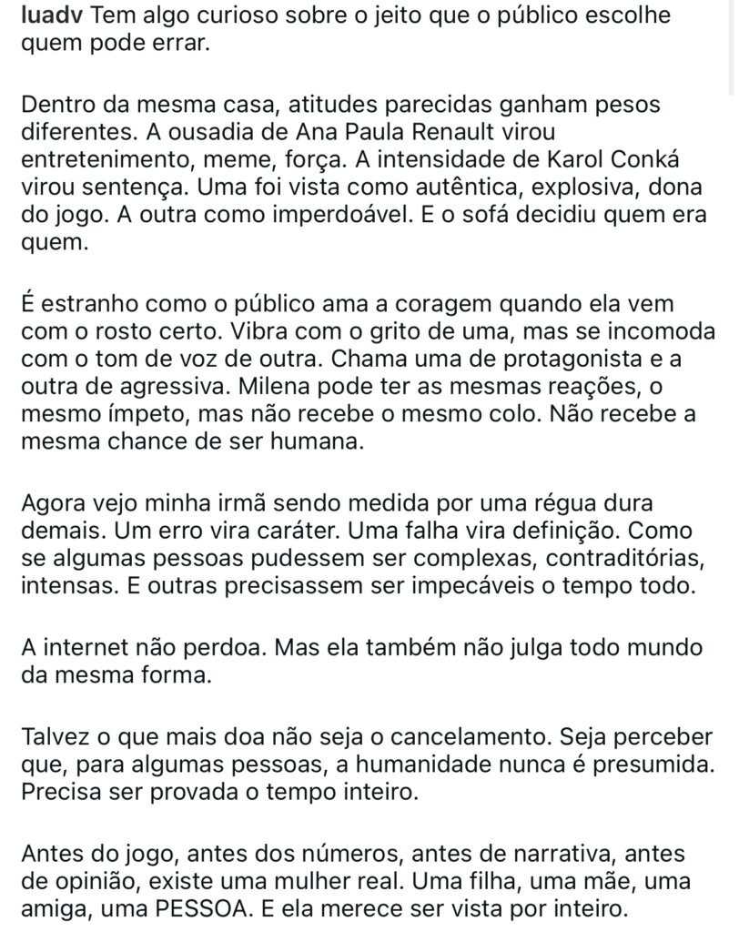 Na publicação, Maria Luiza comparou a repercussão de atitudes consideradas semelhantes dentro do programa. Ela citou exemplos de participantes que tiveram comportamentos intensos avaliados de formas distintas pelo público, destacando que a forma como cada pessoa é percebida influencia diretamente na reação do “público do sofá”.