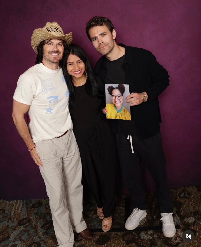 Em uma das imagens, Paul, intérprete de Stefan Salvatore, aparece segurando a foto da sister ao lado de Mile e de Ian, que deu vida ao personagem Damon na série. Além deles, ela também tirou foto com Candice King, que vive Caroline Forbes.