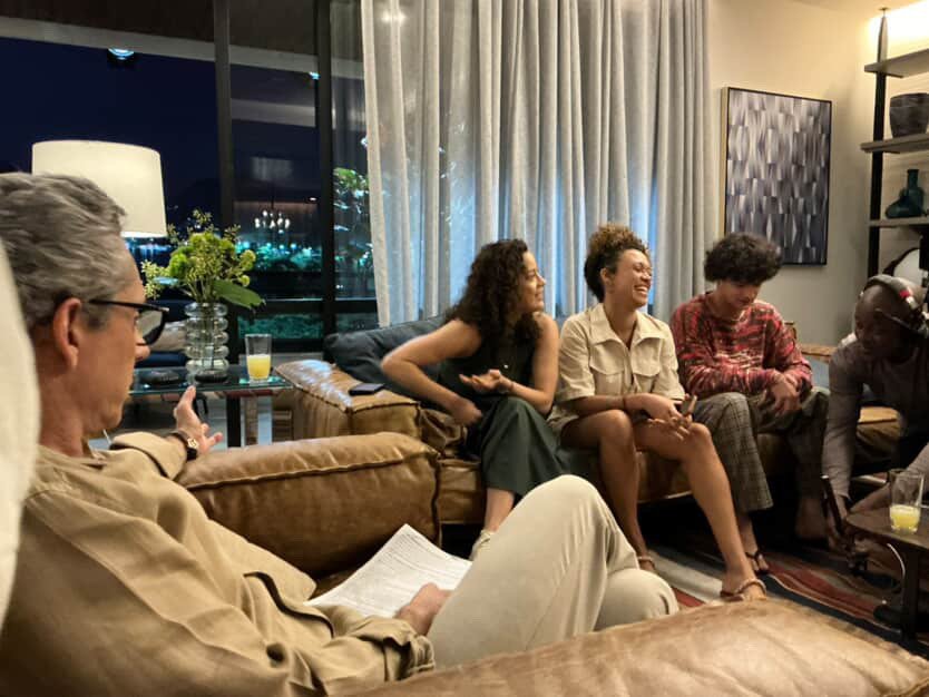 Nos registros, Alexandre Nero (Marco Aurélio) aparece revisando o texto antes de entrar em cena. Em outro momento, é possível ver os atores Pedro Waddington, Maeve Jinkings e Lorena Lima, que interpretam respectivamente Thiago Roitman, Cecília e Laís.