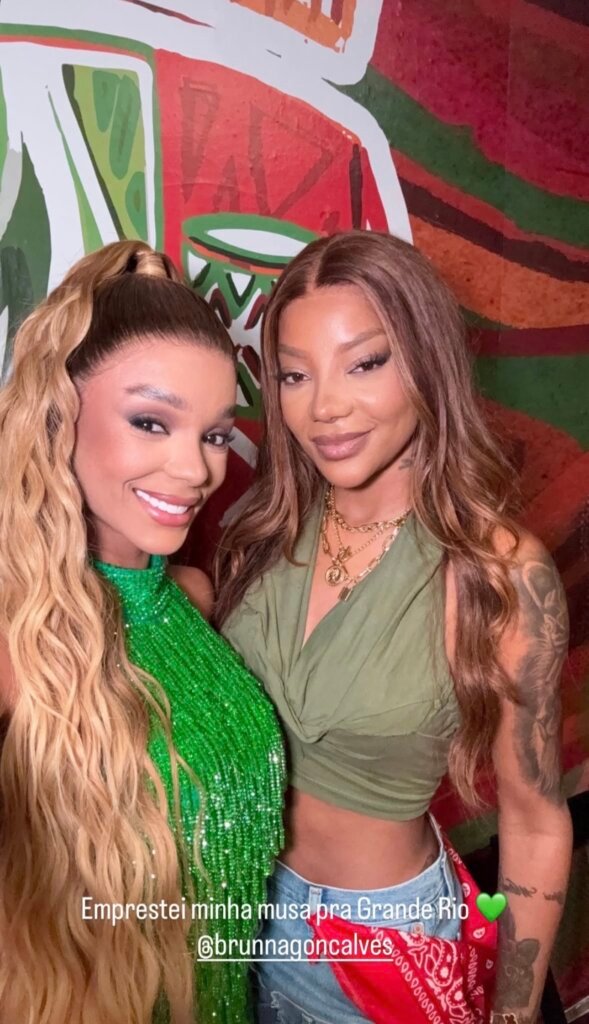 Nas redes sociais, Ludmilla celebrou o momento com a esposa. “Emprestei minha musa para a Grande Rio”, escreveu. A cantora, casada com Brunna desde 2019, prestigiou o evento ao lado da companheira.