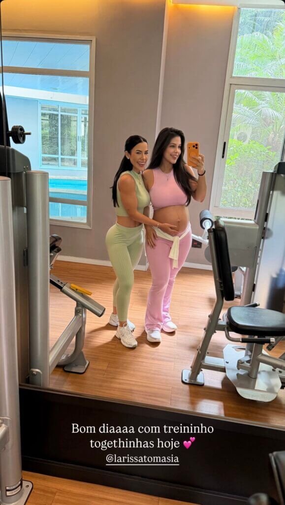 Durante o treino, Laís exibiu a barriguinha da primeira gravidez, fruto do relacionamento com Gustavo Marsengo, que conheceu no Big Brother Brasil 22. “Bom dia com treininho. Togethinhas hoje”, escreveu a médica na legenda ao mostrar o registro ao lado da amiga, .