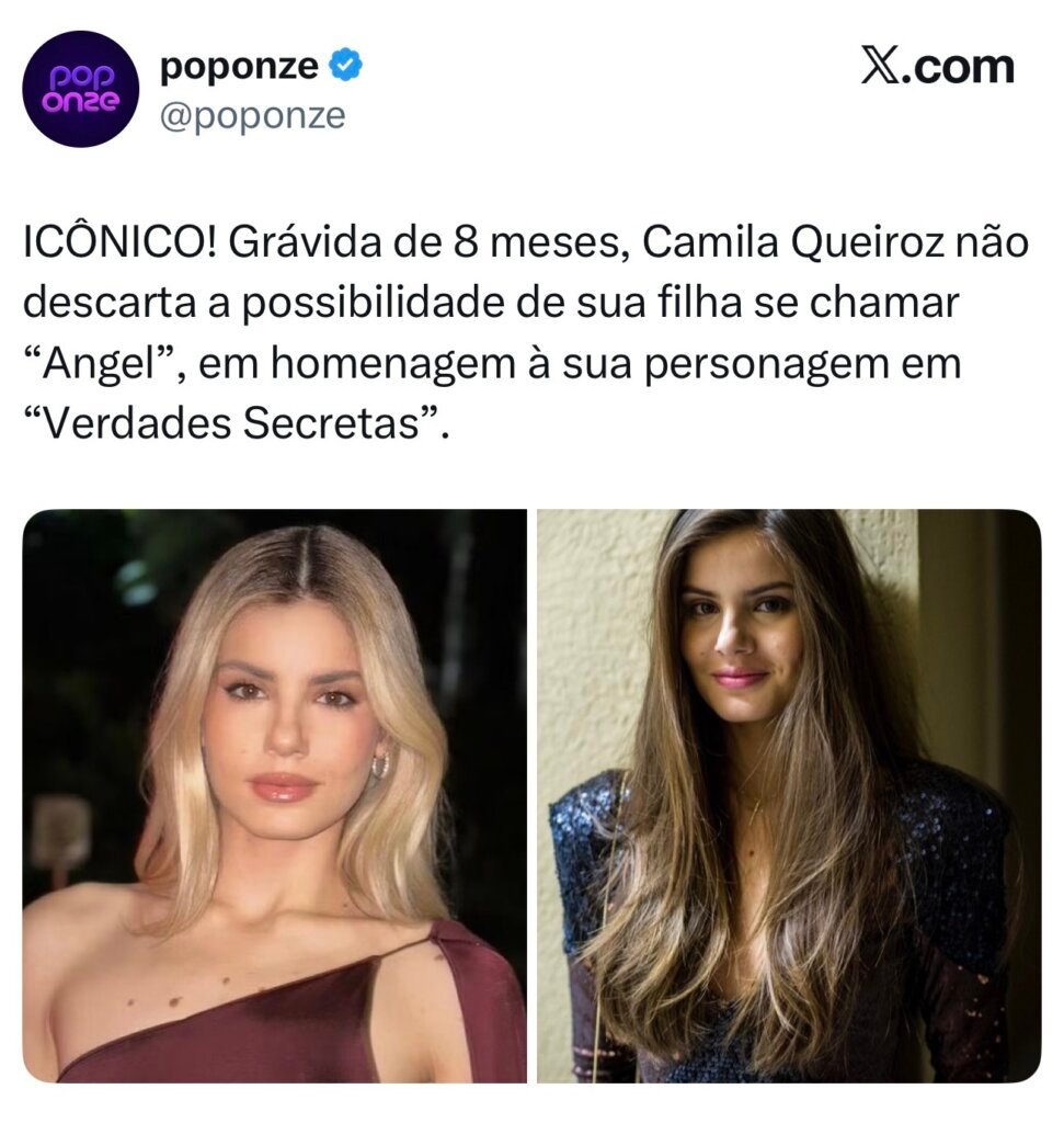 No post, Camila reagiu a uma notícia que afirmava que o casal cogitava o nome “Angel” para a bebê, referência à personagem que interpretou em Verdades Secretas, seu primeiro papel na televisão.