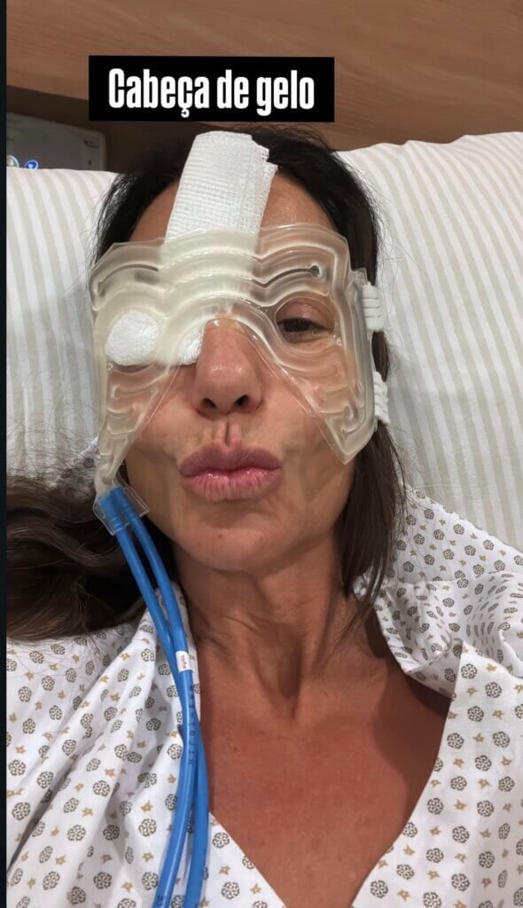 Com bom humor, ela legendou o registro como “cabeça de gelo”. O equipamento é utilizado no pós-operatório de procedimentos faciais para ajudar a reduzir o inchaço e aliviar o desconforto.