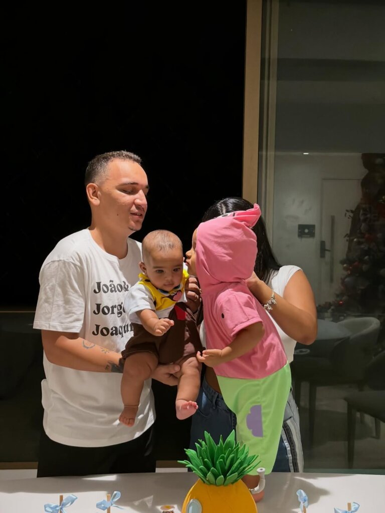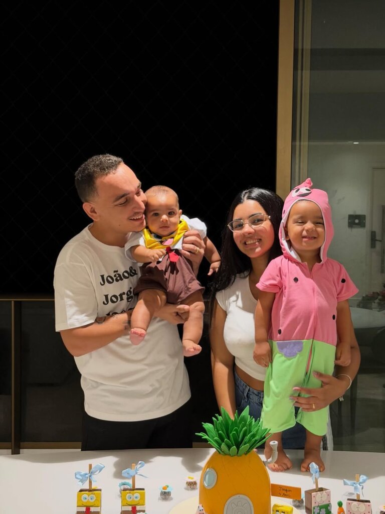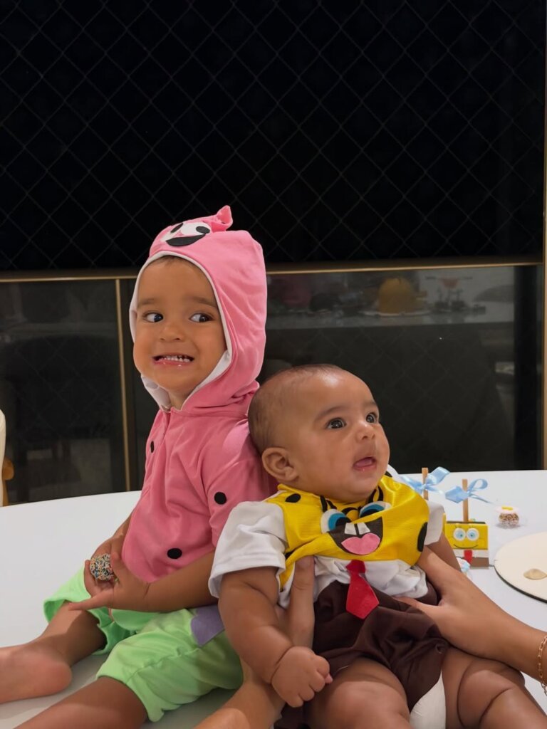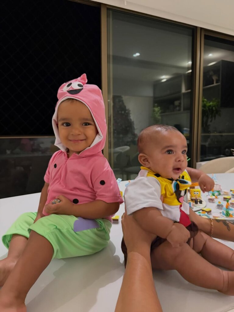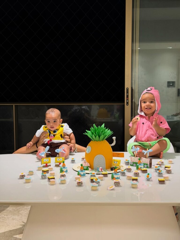 O tema da celebração foi o desenho animado Bob Esponja, e os filhos foram fantasiados para a ocasião. Nas fotos, o primogênito Jorge, nascido em janeiro de 2024, aparece vestido de Patrick, enquanto Joaquim surge como o próprio Bob Esponja.