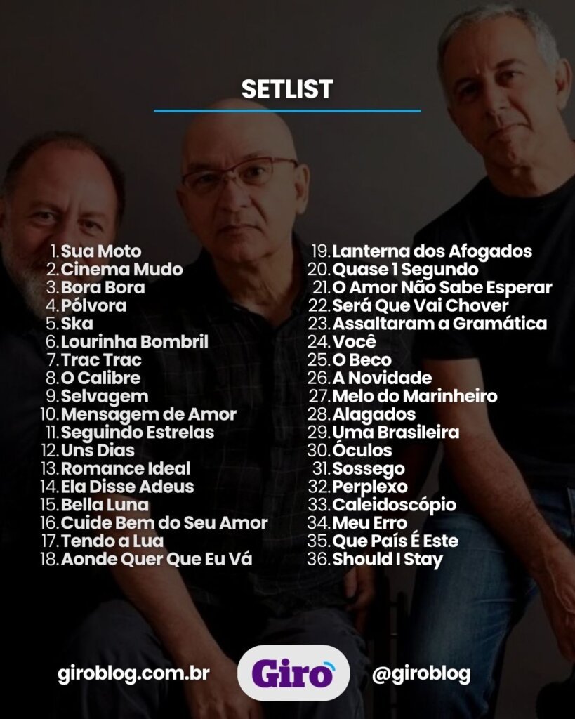 O setlist reúne dezenas de hits que marcaram gerações de fãs, como “Meu Erro”, “Óculos”, “Alagados”, “A Novidade”, “Lanterna dos Afogados” e “Ela Disse Adeus”. Confira o setlist completo abaixo!