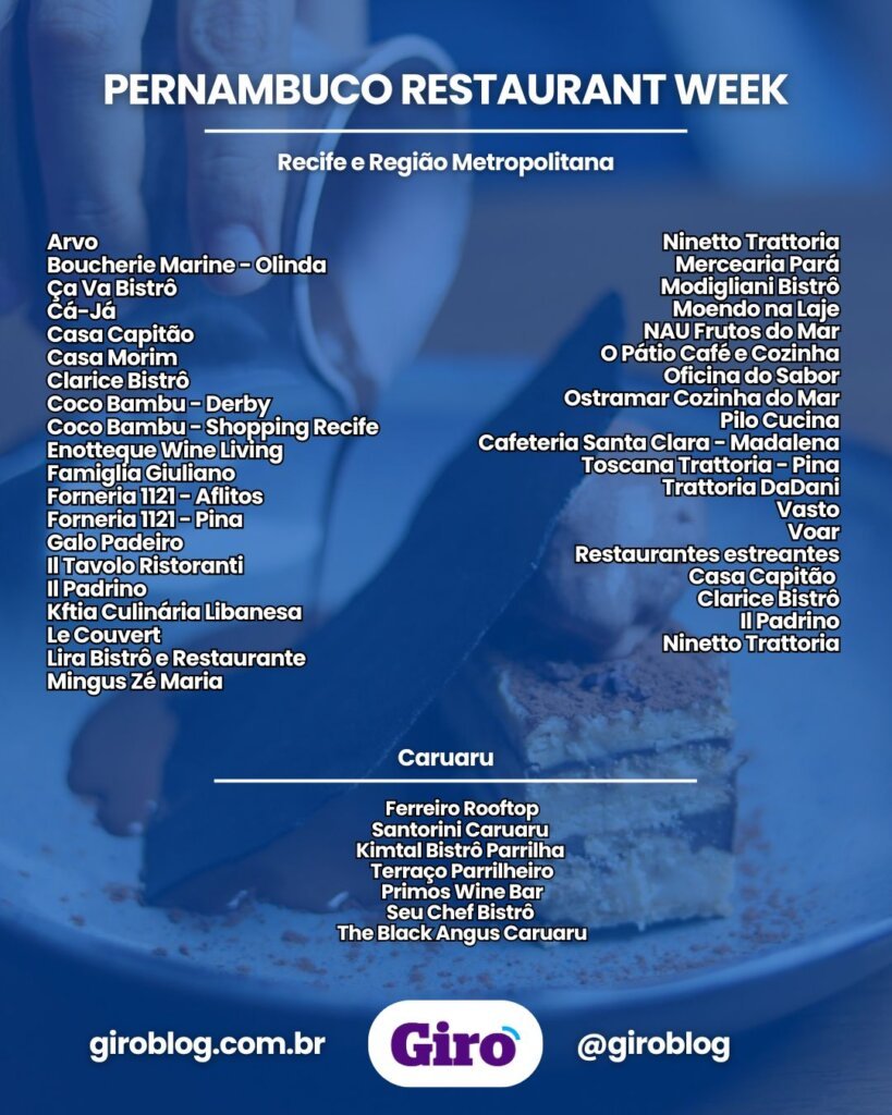 A 24ª edição do Pernambuco Restaurant Week começa nesta sexta-feira (10) e segue até 9 de novembro no Recife e Região Metropolitana. Já em Caruaru, o festival será realizado de 29 de outubro a 21 de novembro. O evento, um dos mais aguardados do calendário gastronômico, reúne mais de 35 restaurantes e cafeterias que oferecem menus completos com entrada, prato principal e sobremesa.