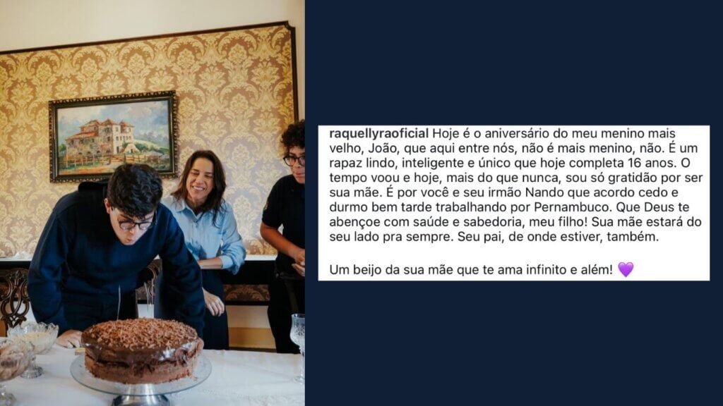 Na publicação, Raquel destacou o crescimento do filho e expressou gratidão pela maternidade. “Hoje é o aniversário do meu menino mais velho, João, que aqui entre nós, não é mais menino, não. É um rapaz lindo, inteligente e único”, escreveu, desejando saúde e sabedoria ao jovem.
