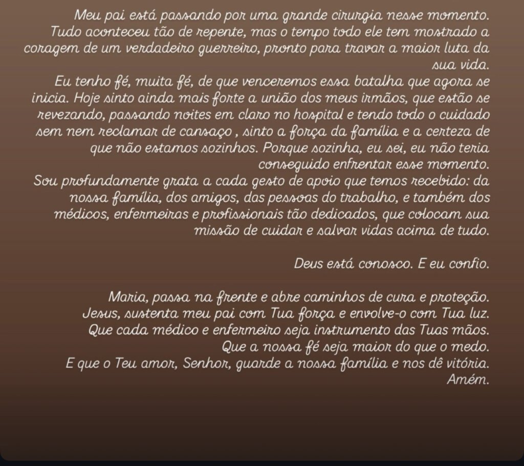 Sabrina destacou ainda a importância da fé neste momento, afirmando confiar na recuperação do pai e no trabalho dos profissionais de saúde envolvidos na cirurgia.
