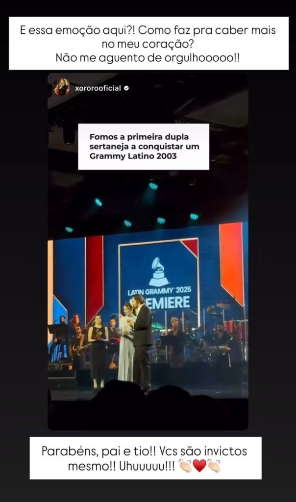 No post, ela não escondeu a emoção e o orgulho ao comentar a conquista. “Como faz pra caber mais no meu coração? Não me aguento de orgulho! Parabéns, pai e tio! Vocês são invictos mesmo!”, escreveu.