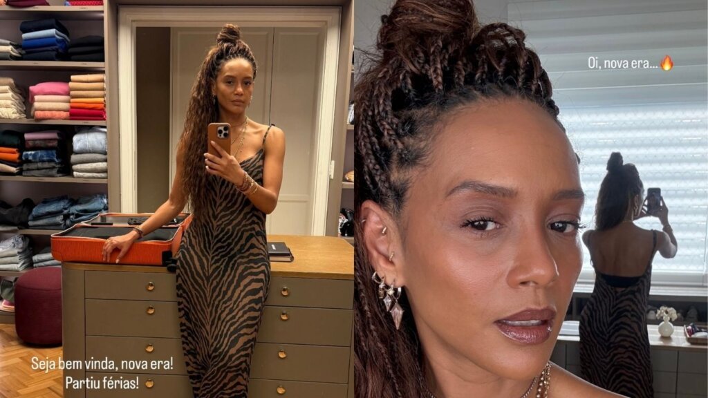 Em um dos cliques, ela aparece em frente ao espelho, com as tranças presas em um semi-coque. “Seja bem-vinda à nova era, partiu férias”, escreveu Taís na legenda.