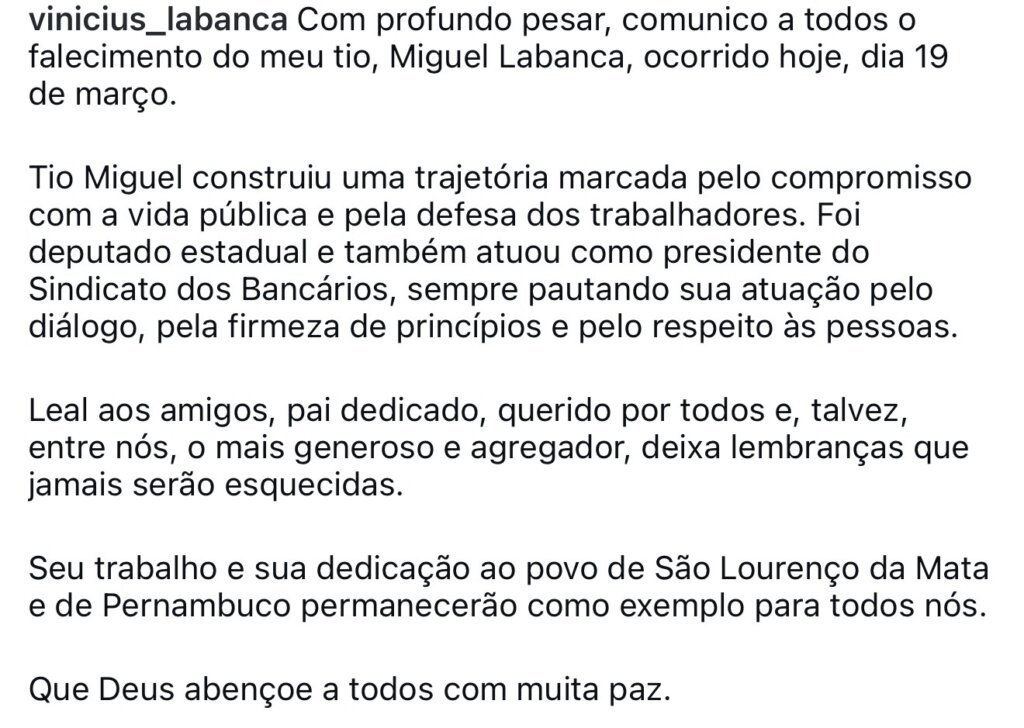 LUTO! Um dia após perder a mãe, o prefeito de São Lourenço da Mata, Vinicius Labanca, usou suas redes sociais para lamentar a morte do tio, o ex-deputado estadual Miguel Labanca. O gestor expressou pesar e destacou a relevância da trajetória do familiar na vida pública.